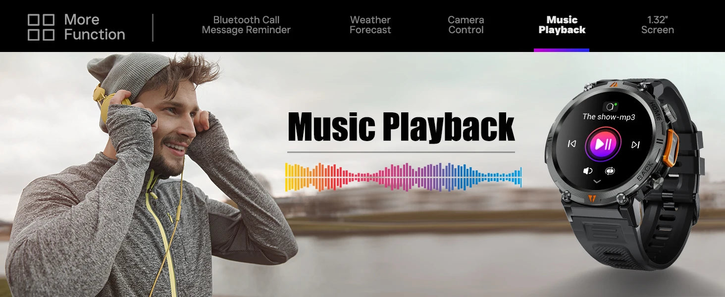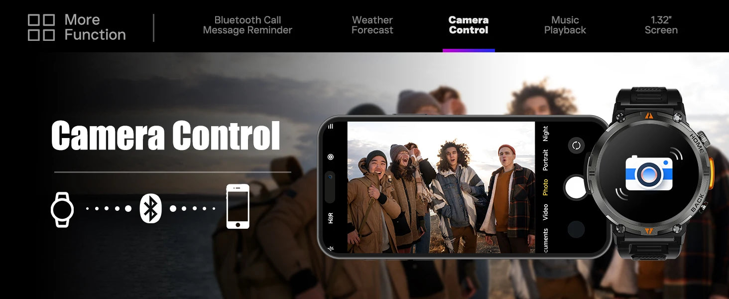 • Additional Features: Stopwatch, Alarm Clock, Countdown, Weather Updates, Remote Camera Control, Interactive Music, and Voice Assistant Integration