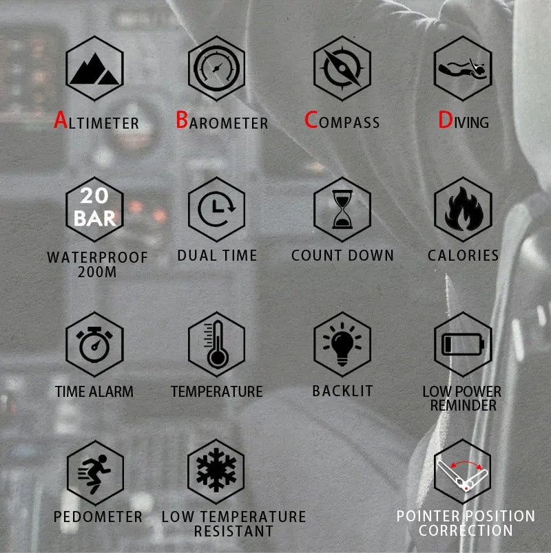 Waterproof to 200M, with features like an altimeter, barometer, compass, and thermometer, this watch is your all-in-one tool for tracking your environment. Ideal for divers, hikers, and fitness enthusiasts, it monitors your dive depth, tracks altitude and pressure, and offers essential time functions, including a stopwatch, countdown timer, and world time.