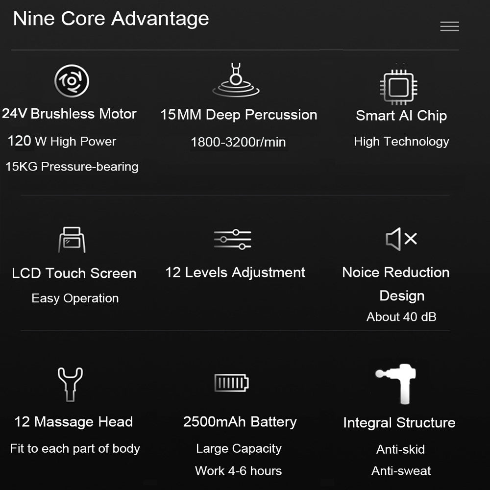 • Motor Power: 24V High-Torque Motor for effective deep tissue massage, delivering powerful relief to sore muscles.